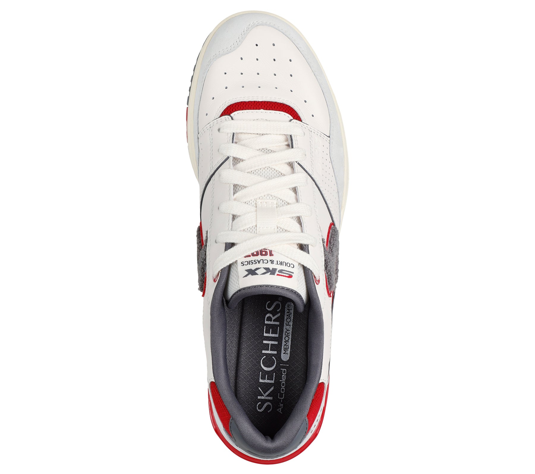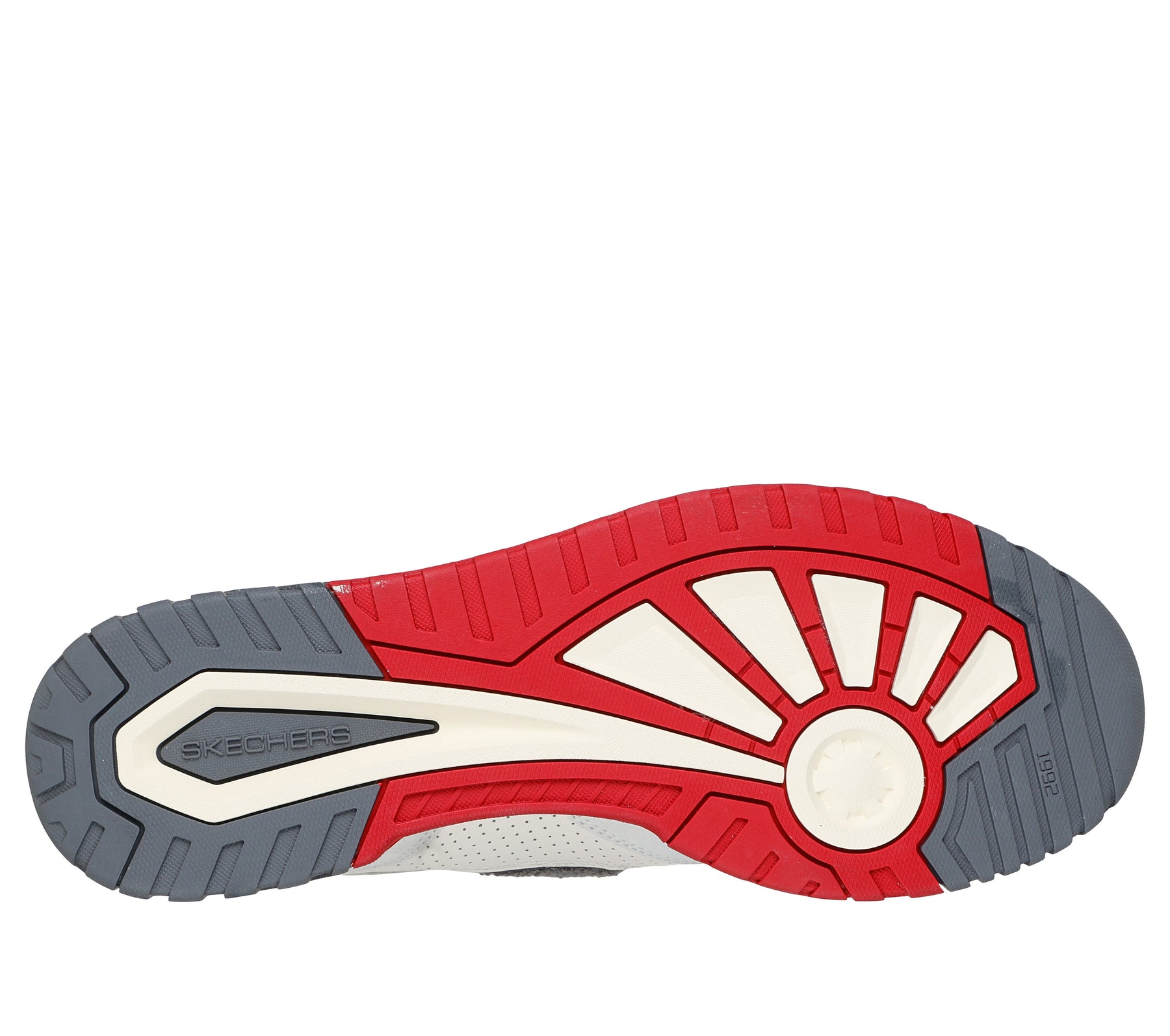 Leather, suede, and mesh upper with textured logo, Casual retro-inspired style with lace-up front, Flexible traction outsole, 1-inch heel height, Skechers® logo detail, Skechers Air-Cooled Memory Foam® cushioned comfort insole.
