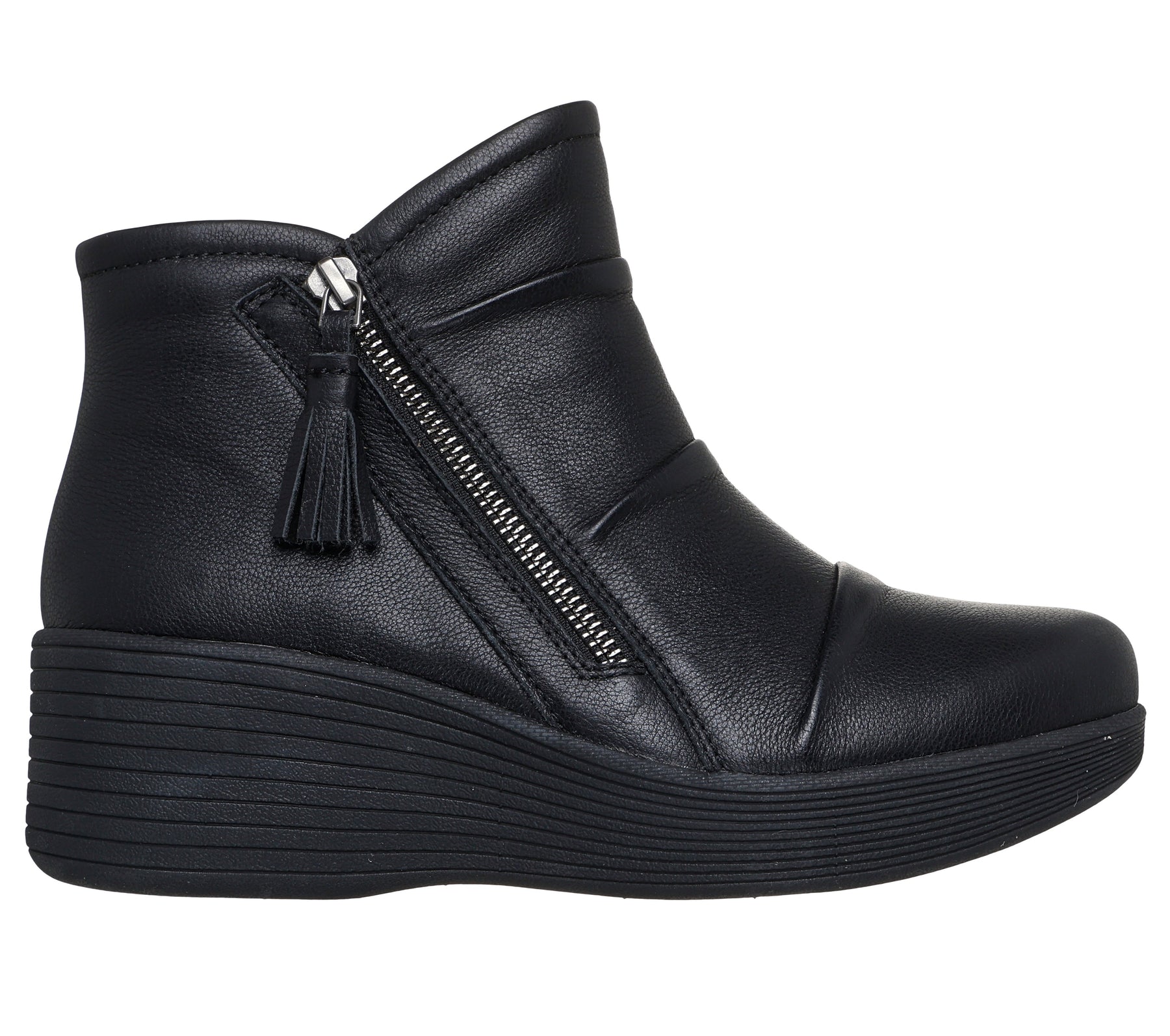 Suede upper with a ruched vamp and side-zip closure, Flexible traction outsole, 2 1/2-inch wedge heel height, Skechers® logo detail, Relaxed Fit® for a roomy comfort fit at toe and forefoot, Skechers Air-Cooled Memory Foam® cushioned comfort insole, Treated with 3M® Scotchgard® to repel water.