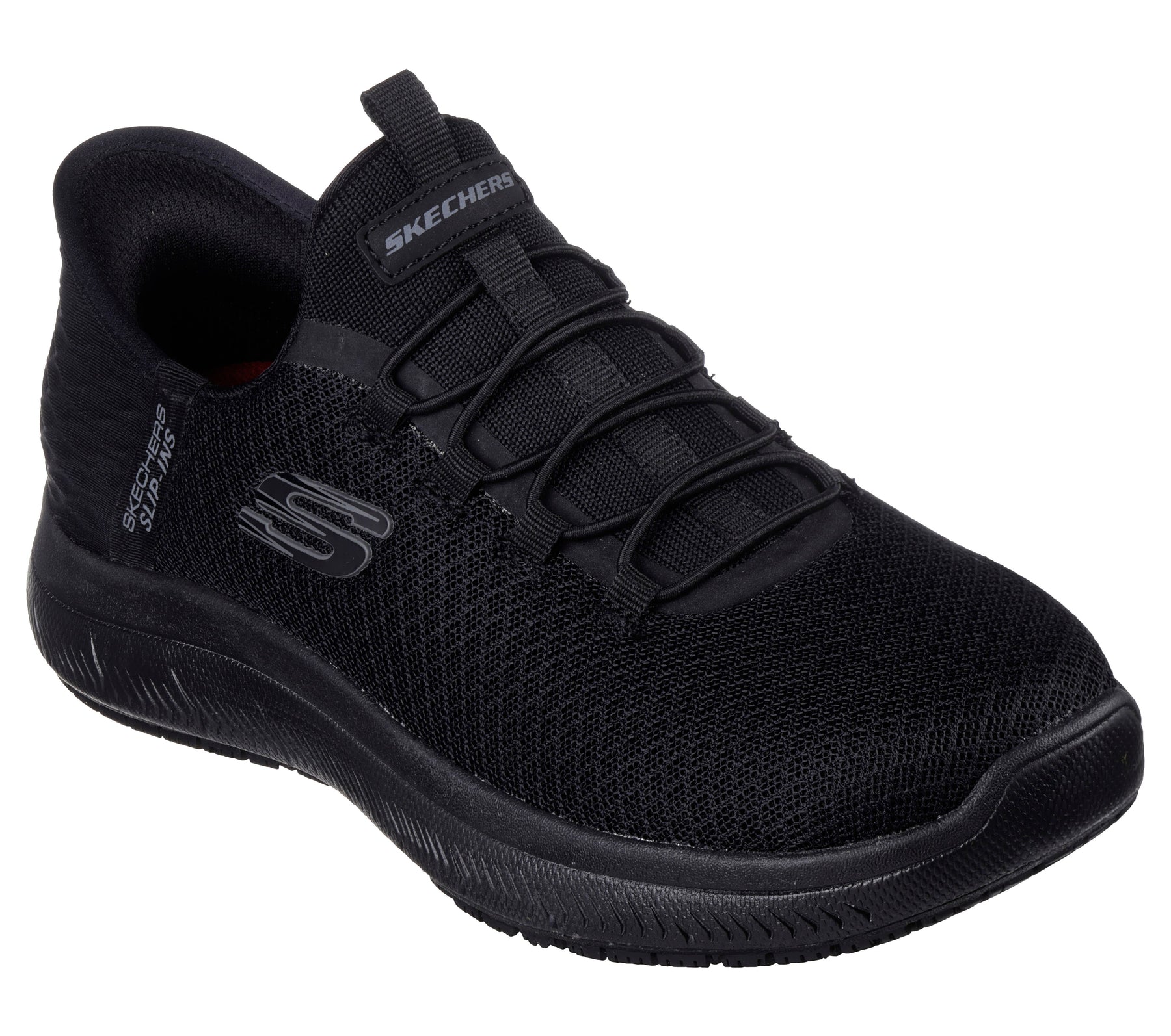 Experience slip-resistant safety with slip-on convenience wearing Skechers Hands Free Slip-ins® Work™: Summits SR - Enslee. This TOUCHLESS FIT® work style features a knit mesh and synthetic upper with our Heel Pillow®, a slip-resistant outsole, plus a Skechers Air-Cooled Memory Foam® cushioned comfort insole.