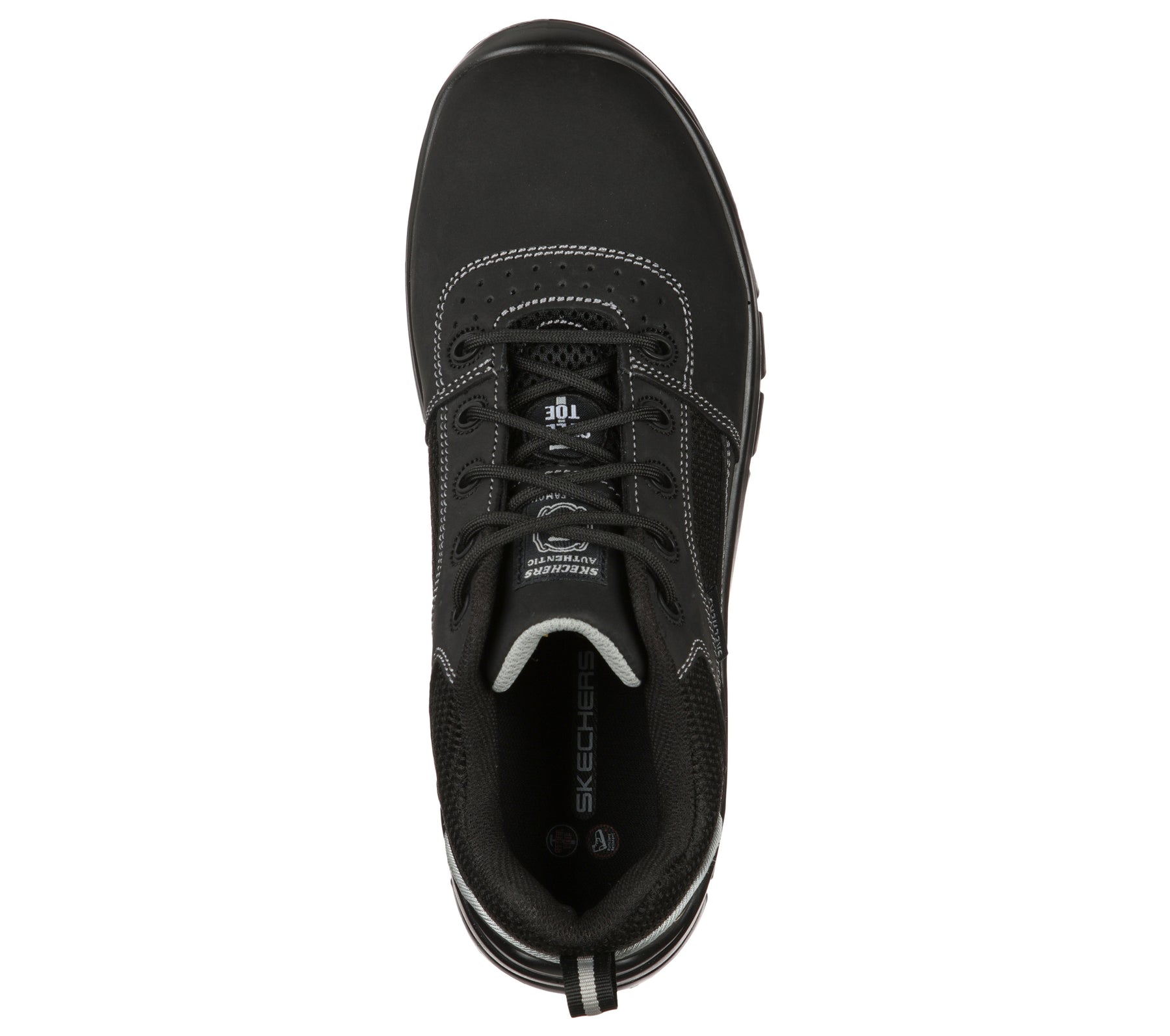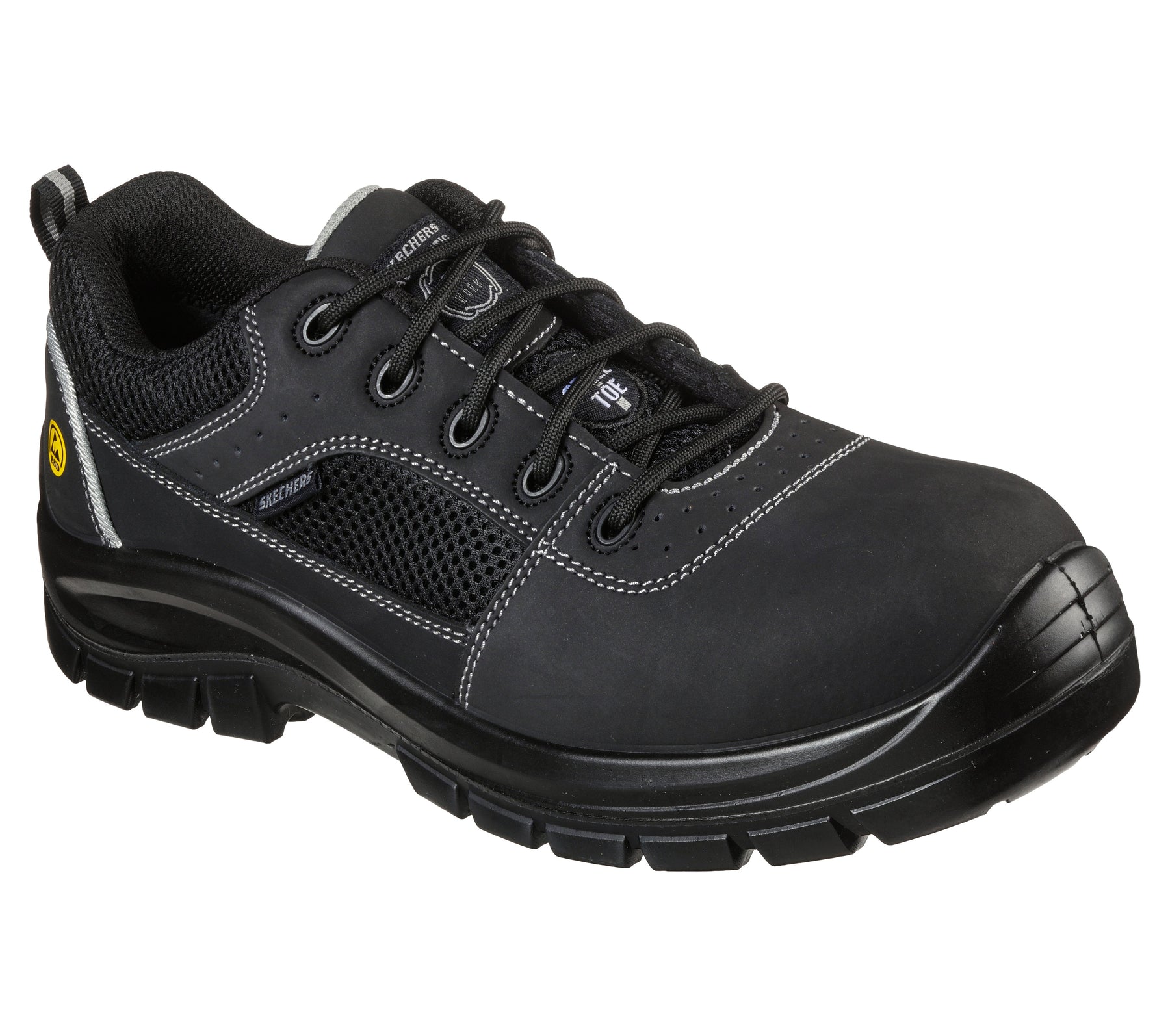 Smooth durable nubuck leather upper with lace-up front, Shock-absorbing midsole, 1 1/4-inch articulated heel, Skechers® logo detail, Steel toe meets EN ISO 20345:2011 standard for impact & compression, Electric Static Dissipative (ESD) design, Hi-Poly puncture resistant insole design, S1 P FO SRA + ESD.