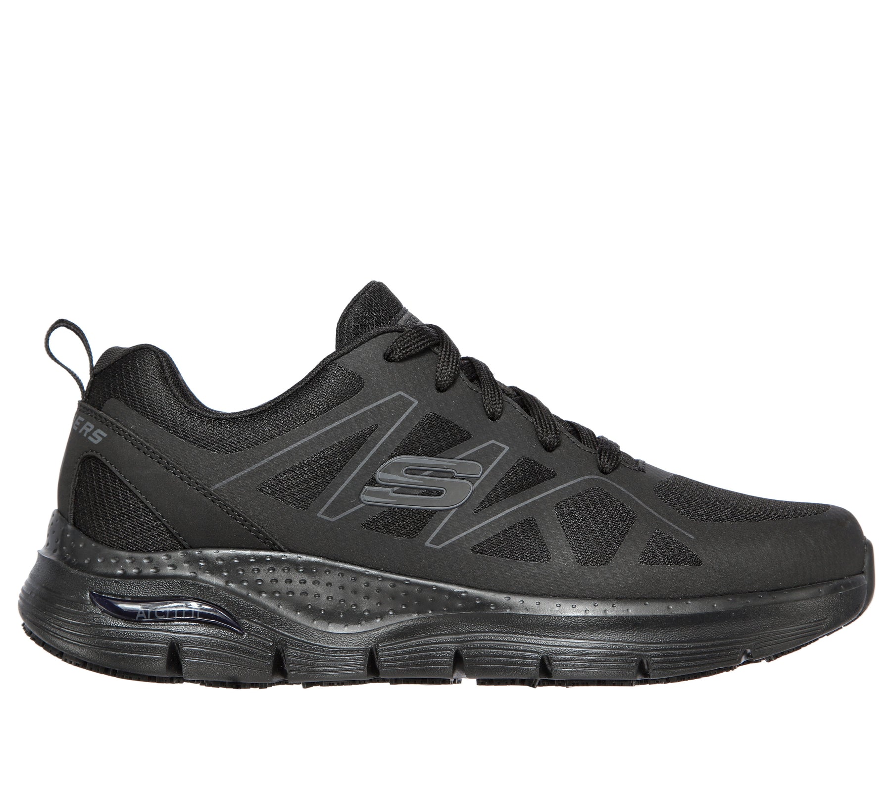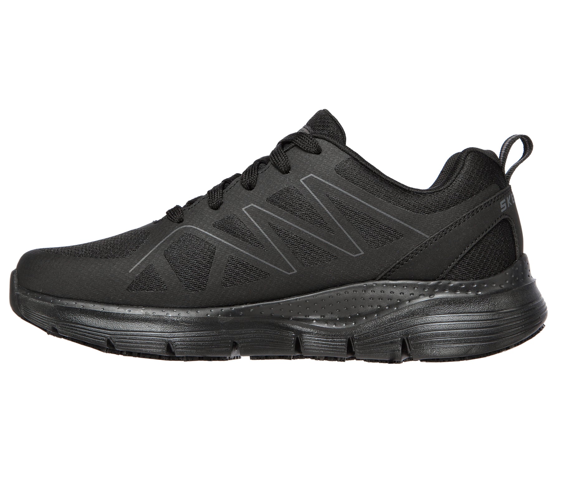 Lace-up synthetic and durable mesh upper, 1 1/4-inch heel height, Skechers® logo detail, This design has been granted the Seal of Acceptance by the American Podiatric Medical Association (APMA), Electrical Hazard (EH) safe design tested ASTM-F2892 Slip-resistant (SRO) rated outsole for traction on wet, dry, oily, and greasy surfaces, Patented Skechers Arch Fit® insole system with podiatrist-certified arch support, Podiatrist-designed shape developed with 20 years of data and 120,000 unweighted foot scans, Removable insole helps mold to your foot to reduce shock and increase weight dispersion.