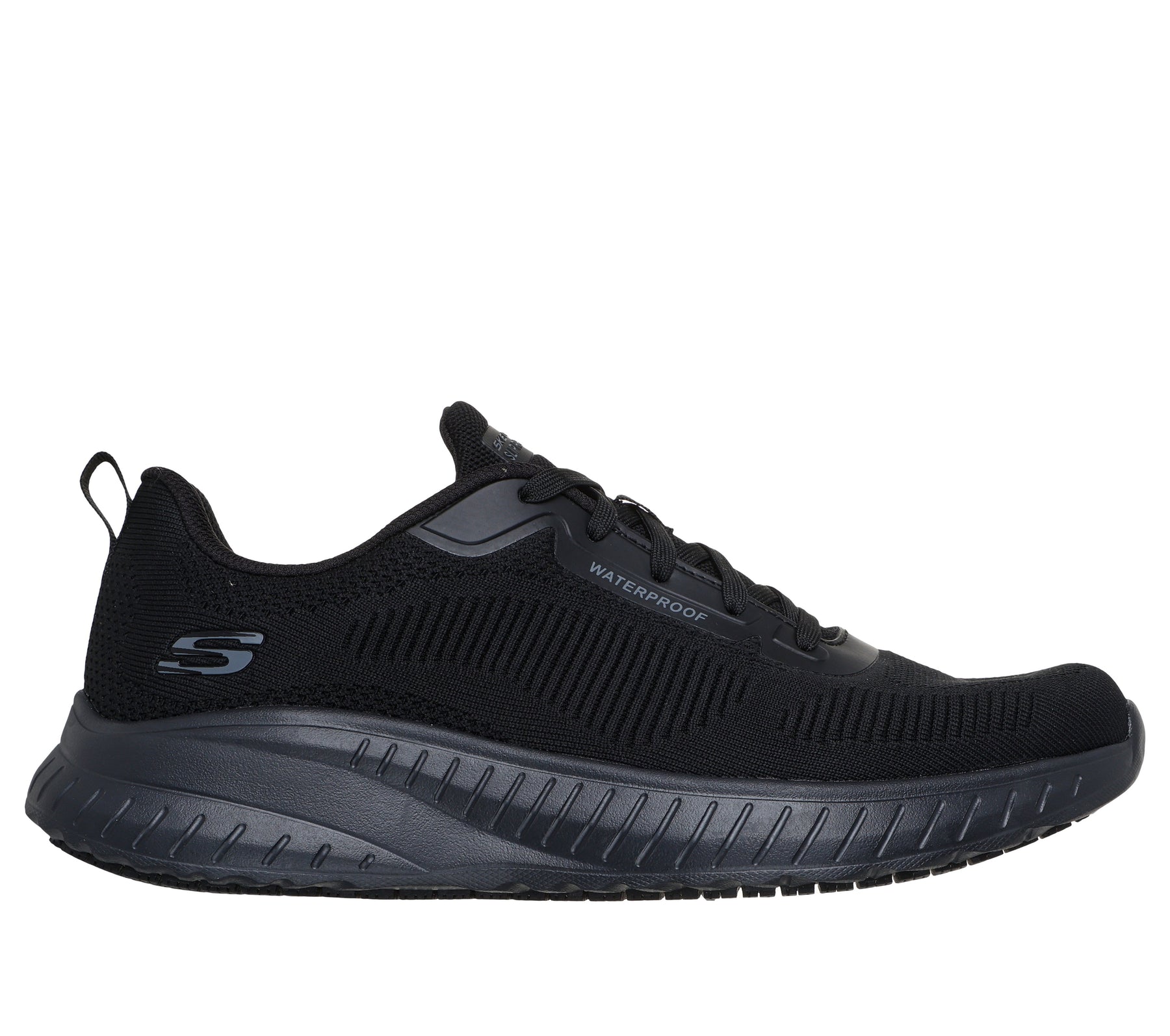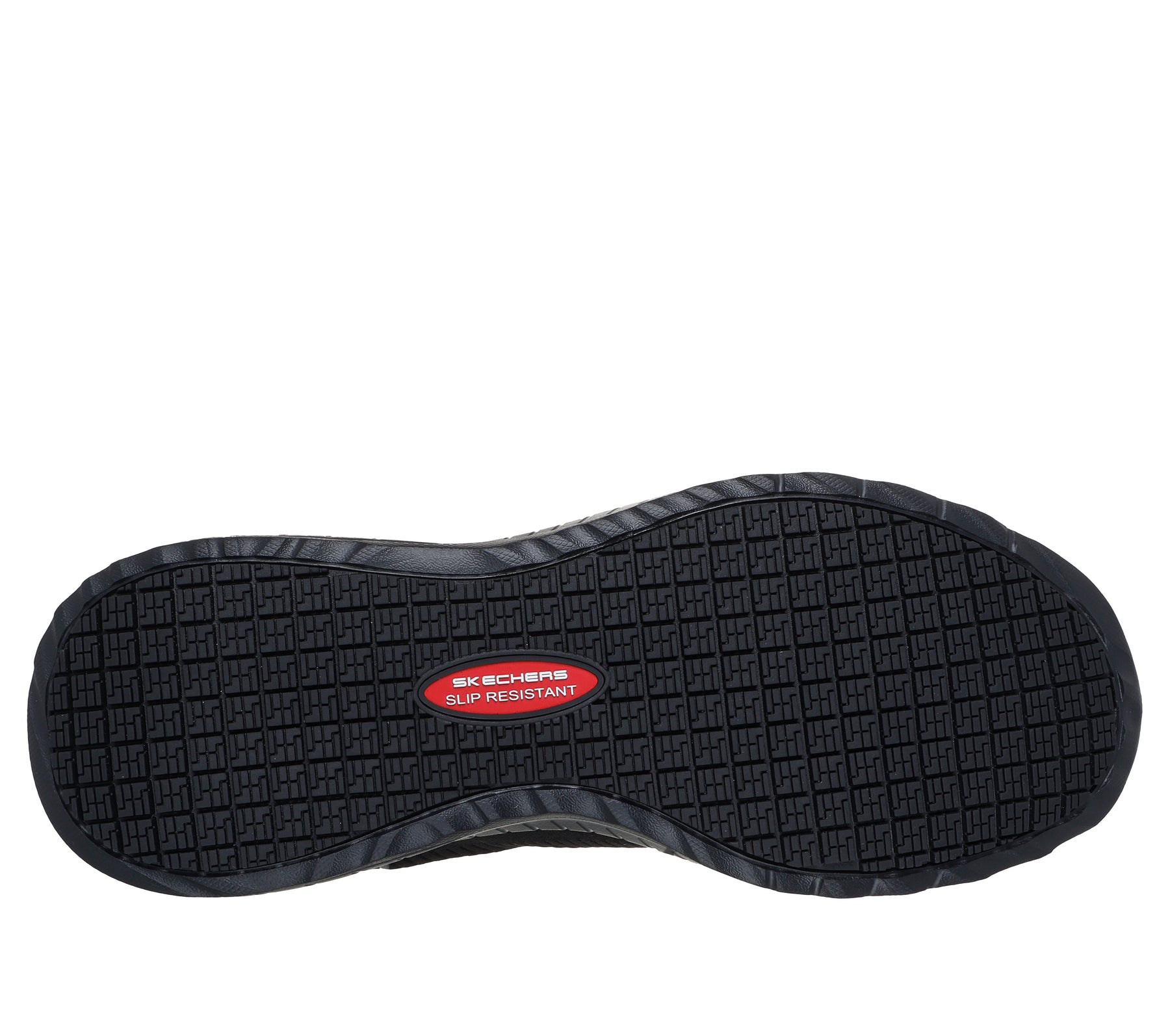 Engineered mesh upper with lace-up front, 1 1/4-inch heel height, Skechers® logo detail, Skechers Air-Cooled Memory Foam® cushioned comfort insole, (SR) Slip resistant rated outsole for traction, (WR) Waterproof construction keeps your feet dry in wet conditions, Tested according to EN ISO 20347:2022+A1:2024 Occupational Footwear Standards, Protection category: OB FO WR SR.